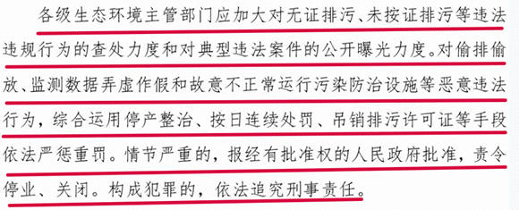 “意見稿”中指出,將對加大對無證排污、未按證排污等違法違規(guī)行為的查處力度,對偷排投放、監(jiān)測數(shù)據(jù)弄虛作假和故意不正常運(yùn)行污染防治設(shè)施等惡意違法行為的,將依法嚴(yán)懲重罰。