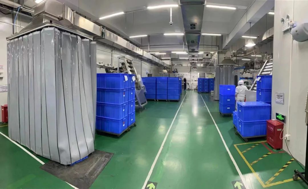 穿過兩道密閉隔斷門,走進(jìn)印刷車間,只見車間環(huán)境干凈整潔,環(huán)氧地坪防腐防滲,生產(chǎn)設(shè)備被塑料膠簾包裹,機(jī)臺(tái)上方還安裝有集氣罩。