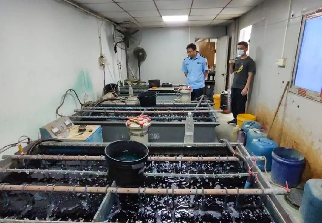 檢查發(fā)現(xiàn),該加工坊主要從事銅件電鑄加工生產(chǎn),未取得生產(chǎn)營業(yè)執(zhí)照,且未辦理環(huán)保審批與自主驗收手續(xù),擅自開設(shè)熔蠟、上蠟、電鑄、噴漆、電烙、開模等生產(chǎn)工序,設(shè)有電鑄槽3個、噴柜1個、電烙鐵1把、噴火槍1把、線鋸1臺、電磁爐1臺等生產(chǎn)設(shè)備。 現(xiàn)場檢查時,該加工坊的電鑄、電烙工序正在生產(chǎn),電鑄槽內(nèi)液體翻滾且有正在電鑄的銅件掛在槽液內(nèi)。執(zhí)法人員立即用pH試紙對水槽內(nèi)的液體進(jìn)行檢測,結(jié)果呈酸性。執(zhí)法人員還發(fā)現(xiàn)其電烙工序未配套相關(guān)污染防治設(shè)施,產(chǎn)生的廢氣未經(jīng)處理,直接通過窗戶和大門對外排放。