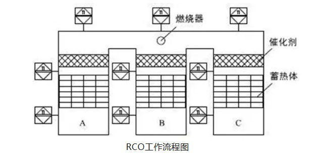 有機廢氣從A室進入,在催化氧化爐內(nèi)被加熱到250~300℃后有機廢氣在貴金屬催化劑的作用下發(fā)生無焰燃燒,廢氣中的有機物被分解成CO2和H2O,通過B室釋放熱量,溫度降低后排放,而蓄熱室B的陶瓷吸熱,“貯存”大量的熱量(用于下個循環(huán)加熱使用),同時C室執(zhí)行反吹動作;在切換新周期后,廢氣從B室進入,經(jīng)催化氧化處理通過C室釋放熱量后排出,同時A室執(zhí)行反吹動作;再下個周期則是廢氣從C室進入,經(jīng)催化氧化處理后通過A室釋放熱量后排出,同時B室執(zhí)行反吹動作;如此循環(huán)往復(fù)。