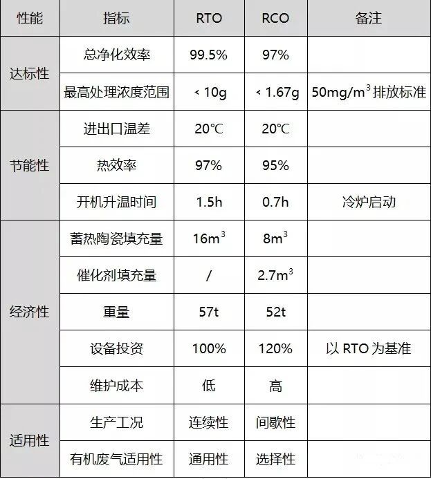 不同類型的RTO/RCO性能差異較大,同樣以三室為例,處理風量30000m3/h時,兩種處理設(shè)備主要性能及關(guān)鍵運行參數(shù)對比如下表所示: